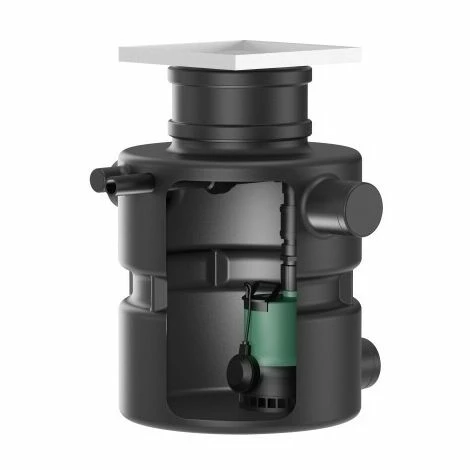anschlussfertig montierte Pumpe mit angebautem Schwimmerschalter im schlagfesten Kunststoffbehälter zum Unterflureinbau, mit Druckleitung, Rückschlagklappe, Abdeckung mit Bodenablauf und Fliesenrahmen, Kabel (5 m bzw. 10 m) mit angebautem Stecker, Einbau- und Betriebsanleitung, Einsatz: Förderung von vorgereinigtem Abwasser ohne Fäkalien, welches nicht über das natürliche Gefälle dem Kanalsystem zugeführt werden kann
