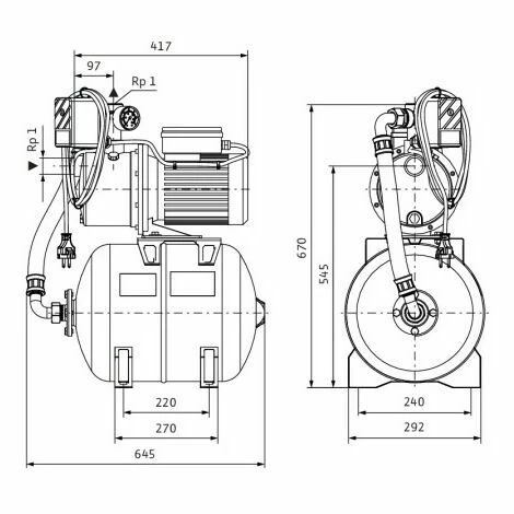 selbstansaugende Wasserversorgungsanlage, zur Beregnung, Bewässerung und Berieselung, Wasserförderung aus Brunnen und tiefer liegenden Behältern, bestehend aus: Pumpe, Druckschalter, Manometer, Membrandruckbehälter (50 l), Druckschlauch mit Stahlmantel und Verschraubung, Einbau- und Betriebsanleitung