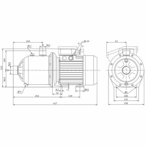 Mehrstufige, geräuscharme, selbstansaugende, horizontale Hochdruck- Kreiselpumpe in Blockbauweise mit horizontalem Saug- und vertikalem Druckstutzen. Neuartiger hydraulischer Ansaugtrakt. Mit durchgehender Motor-Pumpenwelle und drehrichtungsunabhängiger Gleitringdichtung. Direkt angeflanschter Drehstrom- bzw. Wechselstrommotor. Bauseitiger Motorschutz für Drehstrommotor erforderlich. Bei Wechselstrommotor integrierter thermischer Motorschutz und Kondensator. Alle medienberührenden Teile sind korrosionsfrei.